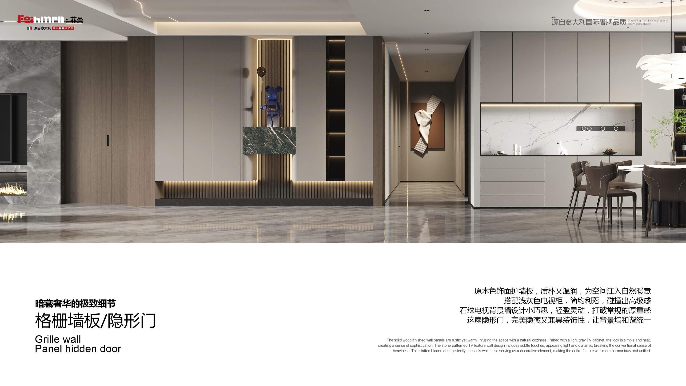 原木色饰面护墙板,质朴又温润,为空间注入自然暖意搭配浅灰色电视柜,简约利落,碰撞出高级感石纹电视背景墙设计小巧思,轻盈灵动,打破常规的厚重感这扇隐形门,完美隐藏又兼具装饰性,让背景墙和谐统一